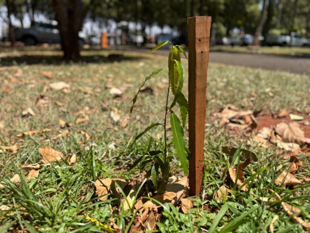 Um mês e meio após o plantio, a muda já se desenvolve de forma tranquila e saudável no jardim. A choupala foi doada à instituição pelo aluno do 8º período de Agronomia, Walisson Pereira, que também é produtor de mudas.